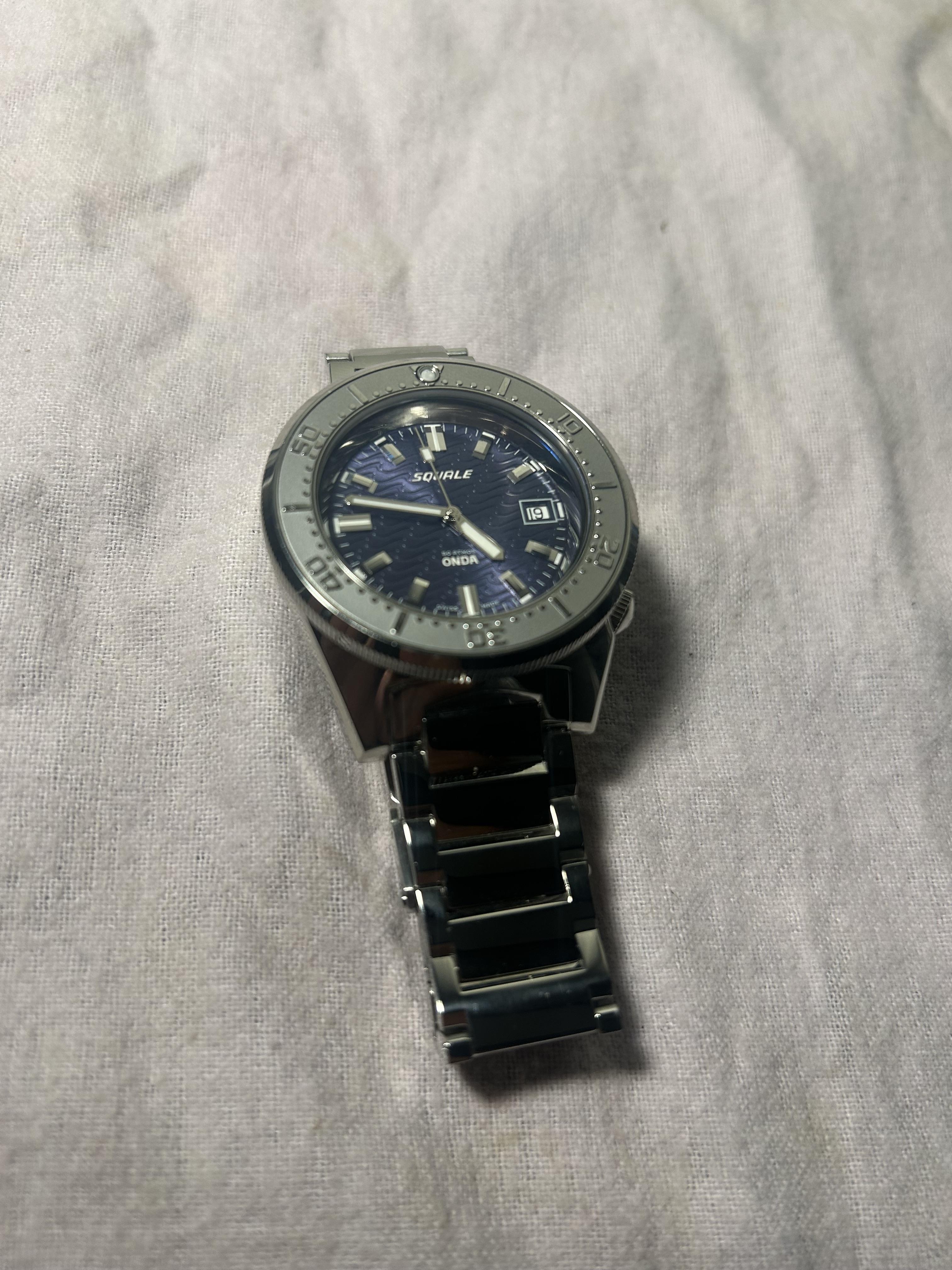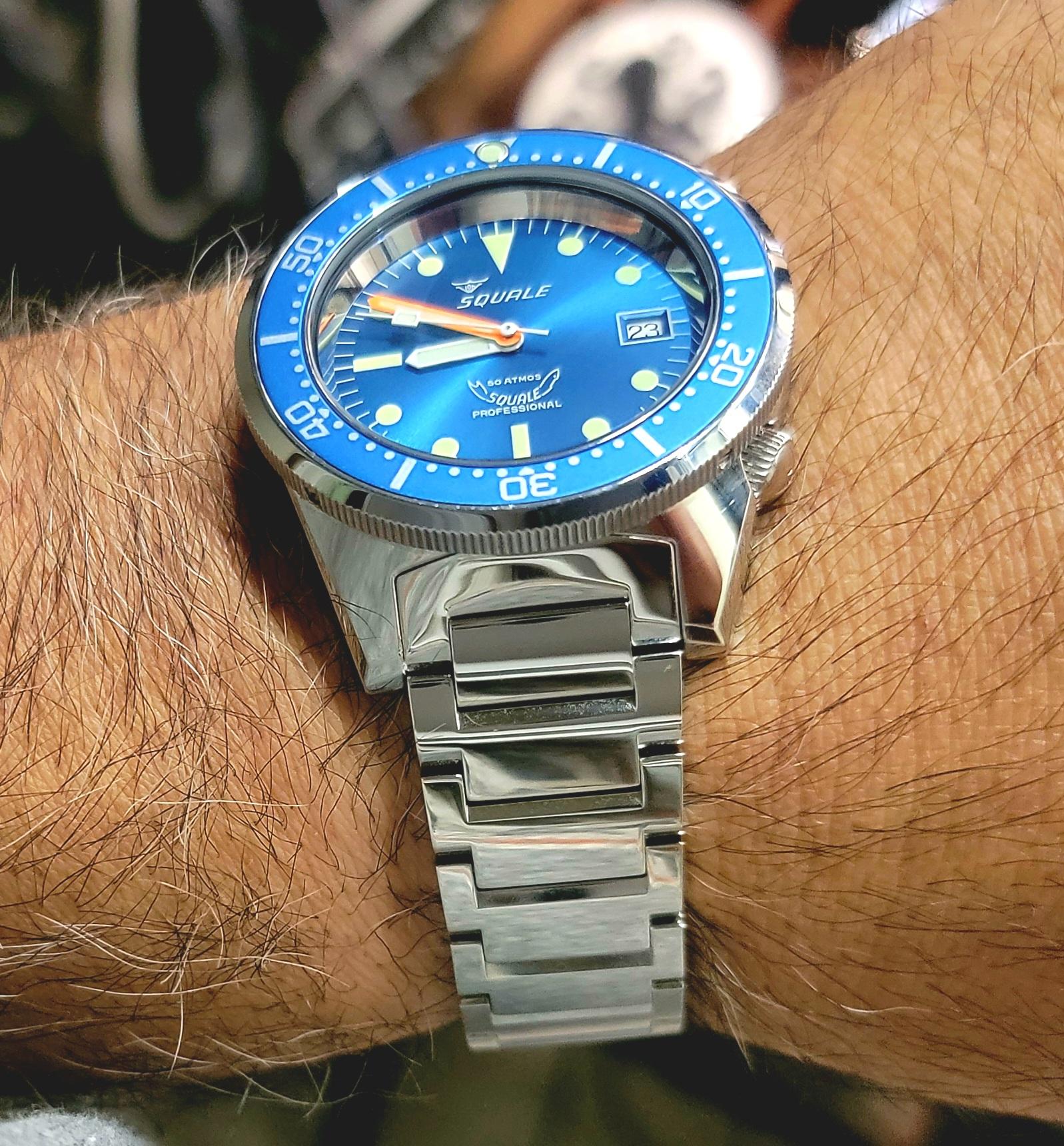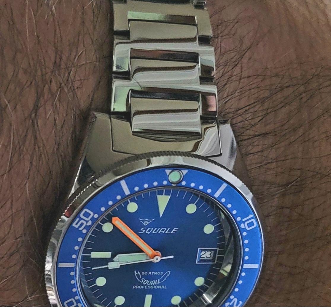 Squale's own bracelet made for the 50 ATMOS (1521) series of watches. The bracelet will fit all current and past models of Squale 1521. This version is the polished version and have a flip-lock deployant clasp with 4 positions of micro-adjust. A hidden diver's extension is included for using over a wet suit. It is solid link, is sized with screws and is a 20mm curved lug. It tapers to 18mm at the clasp.